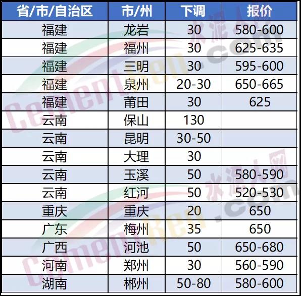 水泥人网通讯员消息,近期福建、云南、湖南省内多区域水泥价格下跌30-80元/吨。