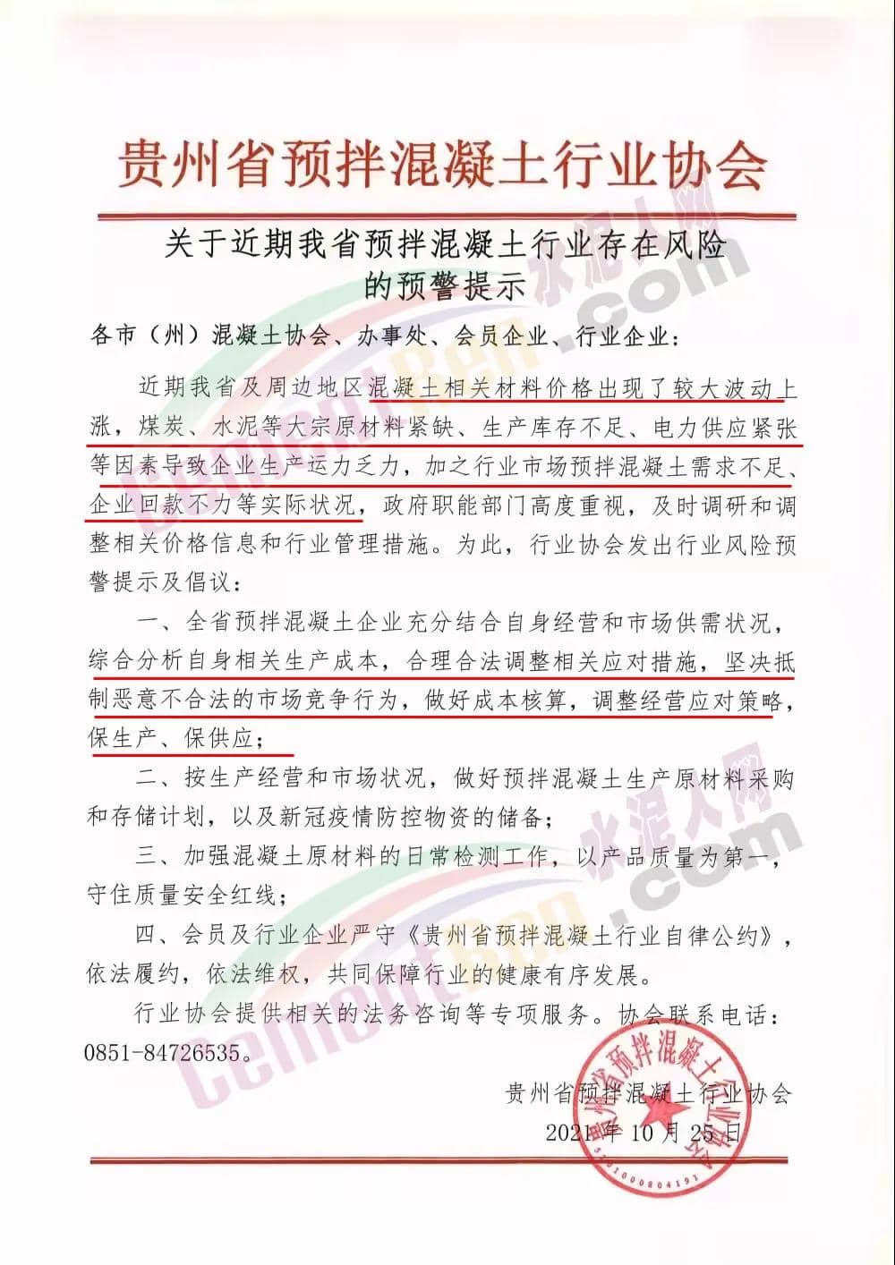 25日,贵州省预拌混凝土行业协会发布《关于近期我省预拌混凝土行业存在风险的预警提示》称,近期贵州省及周边地区混凝土相关材料价格出现了较大波动上涨,煤炭、水泥等大宗原材料紧缺、生产库存不足、电力供应紧张等因素导致企业生产运力乏力,加之行业市场预拌混凝土需求不足、企业回款不力等实际状况,政府职能部门高度重视,及时调研和调整相关价格信息和行业管理措施。