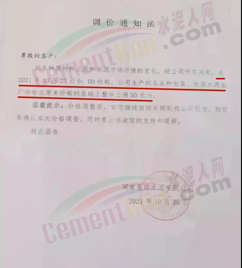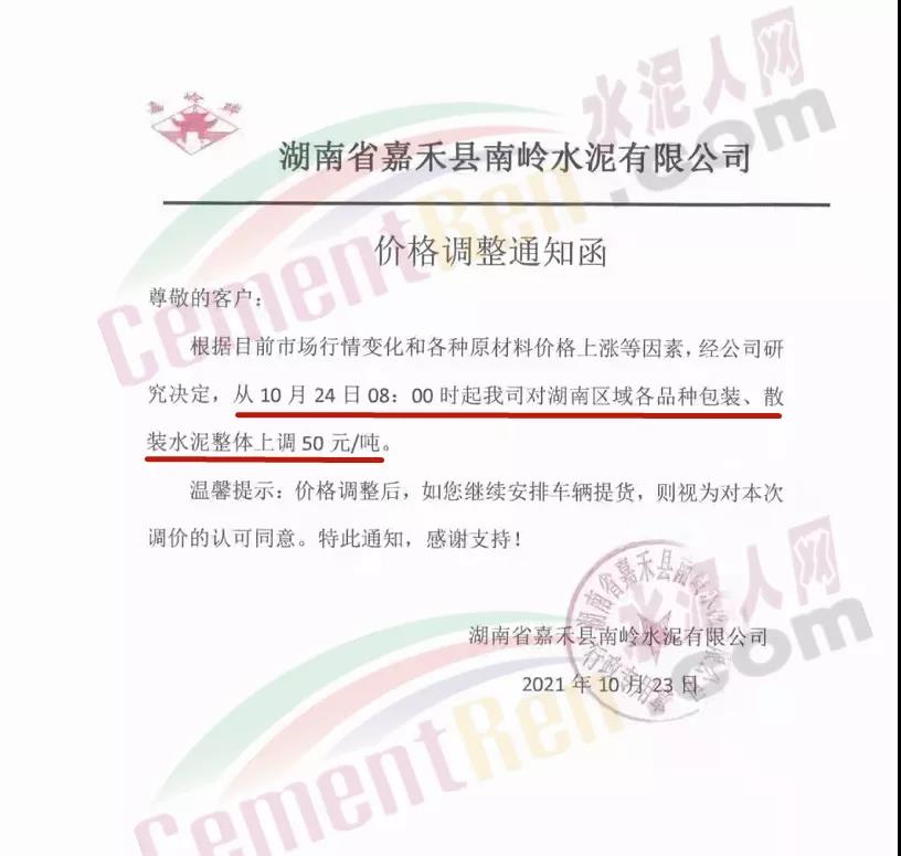 湖南省嘉禾县南岭水泥有限公司通知,根据目前市场行情变化和各种原材料价格上涨等因素,经公司研究决定从10月24日8时起,对湖南区域各品种包装、散装水泥整体上调50元/吨。
