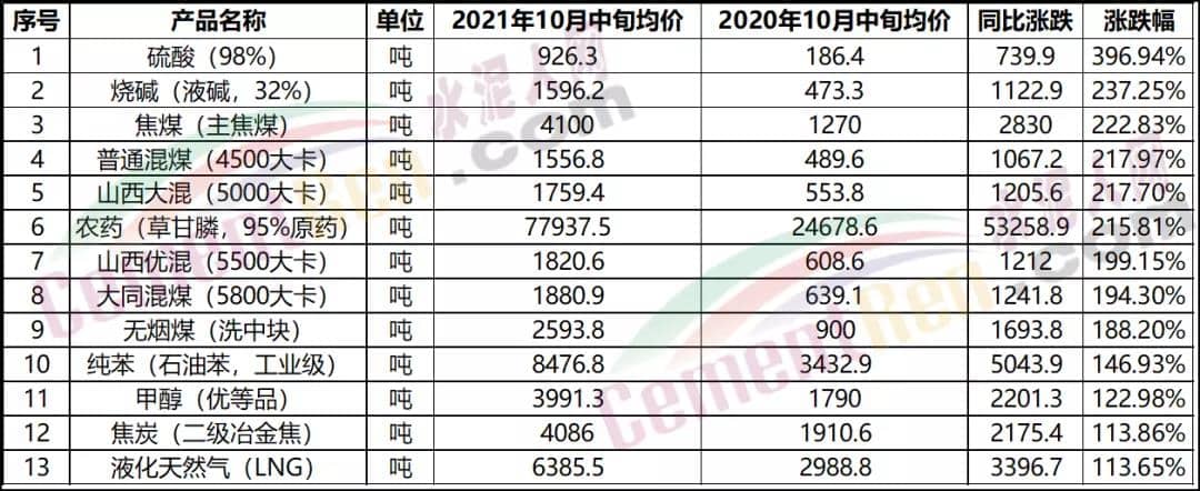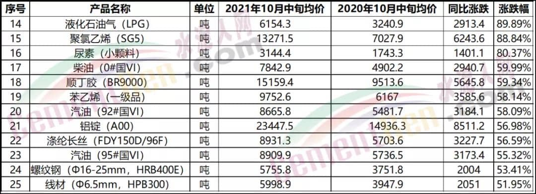 据国家统计局官网公布的全国流通领域9大类50种重要生产资料市场价格的监测数据显示,2021年10月中旬同比2020年10月中旬47种产品价格上涨,3种下降。其中13种产品涨幅在100%以上,12种产品涨幅在50%~90%之间。