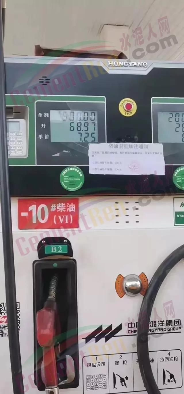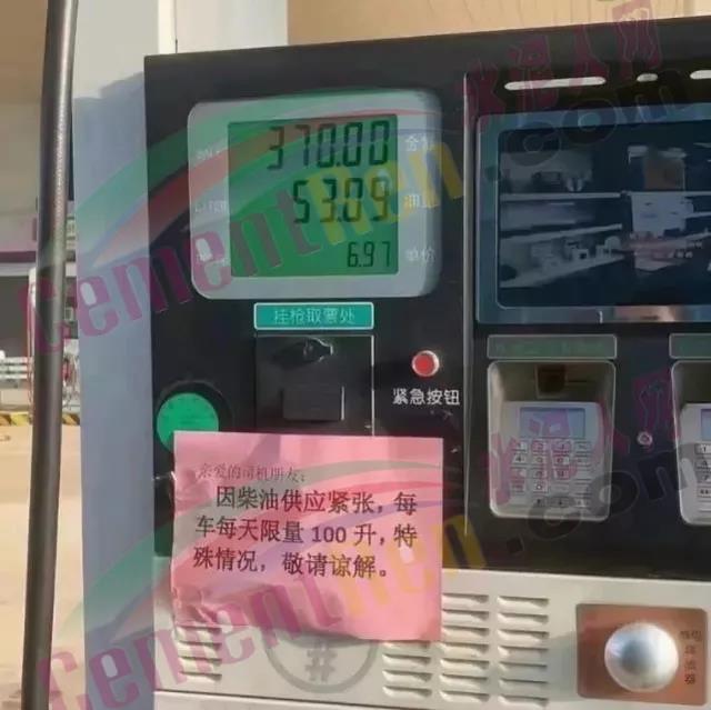 从图片中可以看出,在加油站油箱上,醒目的贴上“因柴油价格供应紧张,每车每天限量100升,特殊情况,敬请谅解”。