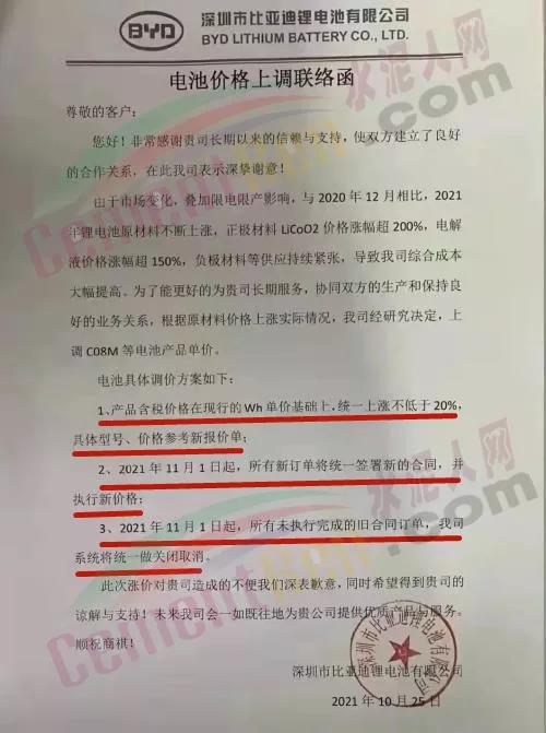 近日比亚迪发布通知称,由于市场变化、叠加限电限产影响,与2020年12月相比,2021年锂电池原材料不断上涨,正极材料LiCoO2价格涨幅超200%,电解液价格涨幅超150%,负极材料等供应持续紧张,导致综合成本大幅提高。根据原材料价格上涨实际情况,深圳市比亚迪锂电池有限公司经研究决定,上调CO8M等电池产品单价。