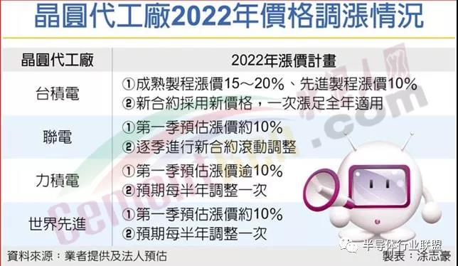 代工产能供应荒或将持续至2022年,继台积电后,联电、力积电、世界先进等,据称近期已陆续通知客户明年第一季度再度涨价超10%,且强调上半年产能已全部预订完毕,订单能见度看至下半年。据台媒报道,根据业内预估,台积电方面明年涨幅在10%-20%之间,价格全年适用,联电、力积电、世界先进明年第一季度涨价均超10%,但此后均可能再调整,其中联电逐季滚动调整,力积电、世界先进均为每半年调整一次。