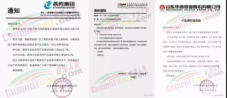 10月以来、金光纸业、晨鸣纸业、华泰纸业、亚太森博、岳阳林纸、银河纸业、江河纸业等纸企先后对旗下的文化纸发布了涨价通知,涨幅普遍在300元/吨。这是年初涨价后,文化纸行业首次行业性的大涨价。