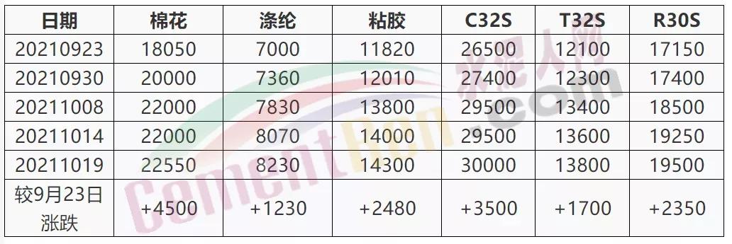 截止10月21日,三大棉纺原料较9月23日分别上涨了4500元/吨、1230元/吨、2480元/吨。