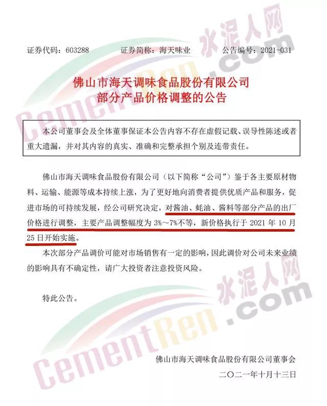 10月12日,海天味业发布部分产品价格调整公告,公告称对酱油、蚝油、酱料等部分产品的出厂价格进行调整,调整幅度为3%~7%不等,新价格执行于2021年10月25日开始实施。