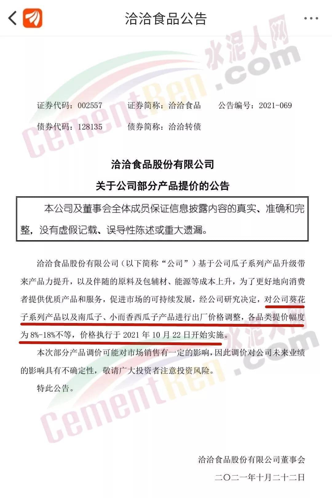 10月22日下午,炒货龙头企业洽洽食品宣布,对公司葵花子系列产品以及南瓜子、小而香西瓜子产品进行出厂价格调整,各品类提价幅度为8%-18%不等,价格于2021年10月22日开始实施。