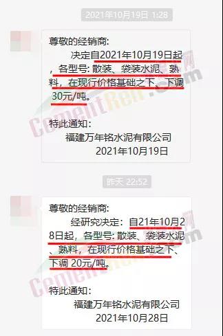 福建万年铭水泥有限公司继19日发通知下调各标号水泥及熟料价格30元/吨后,于28日再次通知,下调各型号散装、袋装、熟料在现行价格基础上再次下调20元/吨,10天内累计下调50元/吨。