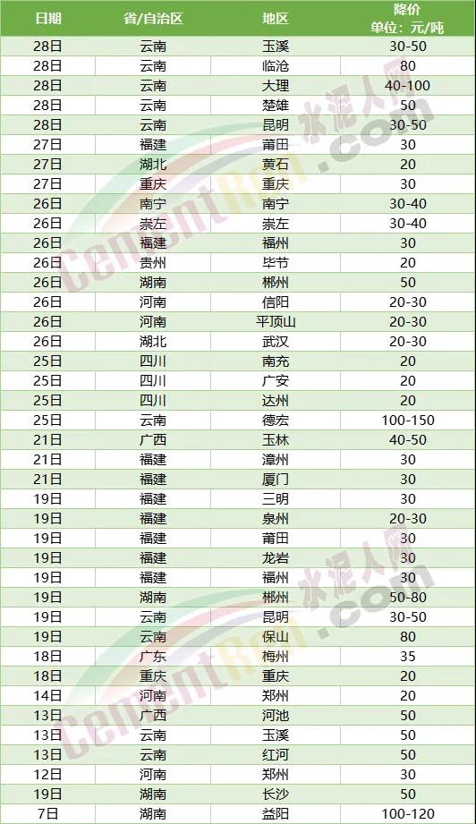 云南昆明、玉溪等区域已经连续三轮下调水泥价格,累计下调已达100元/吨左右;