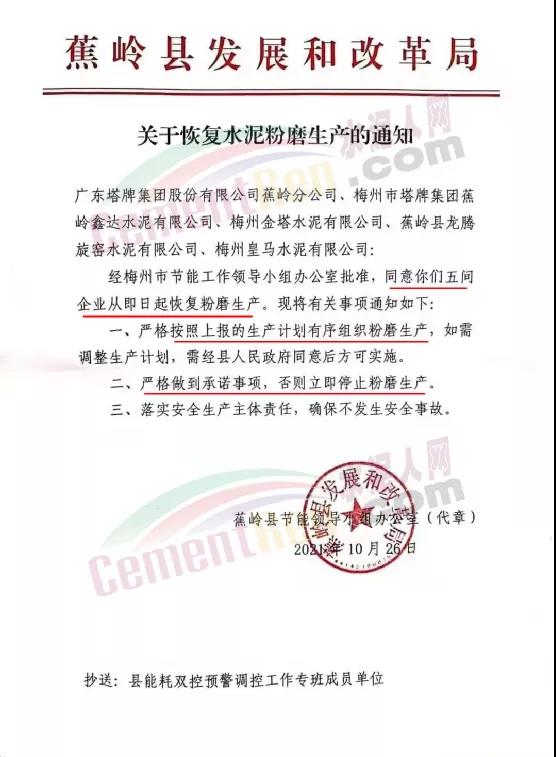 日前,广东省梅州市蕉岭县发改局发布《关于恢复水泥粉磨生产的通知》给广东塔牌集团股份有限公司蕉岭分公司、梅州市塔牌集团蕉岭鑫达水泥有限公司、梅州金塔水泥有限公司、蕉岭县龙腾旋窑水泥有限公司、梅州皇马水泥有限公司五家企业称,经梅州市节能工作领导小组办公室批准,同意上述五家企业从即日起恢复粉磨生产。