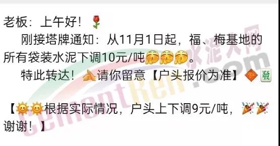 塔牌水泥经销商发通知称,接塔牌通知,从11月1日起福、梅基地的所有袋装水泥下调10元/吨。