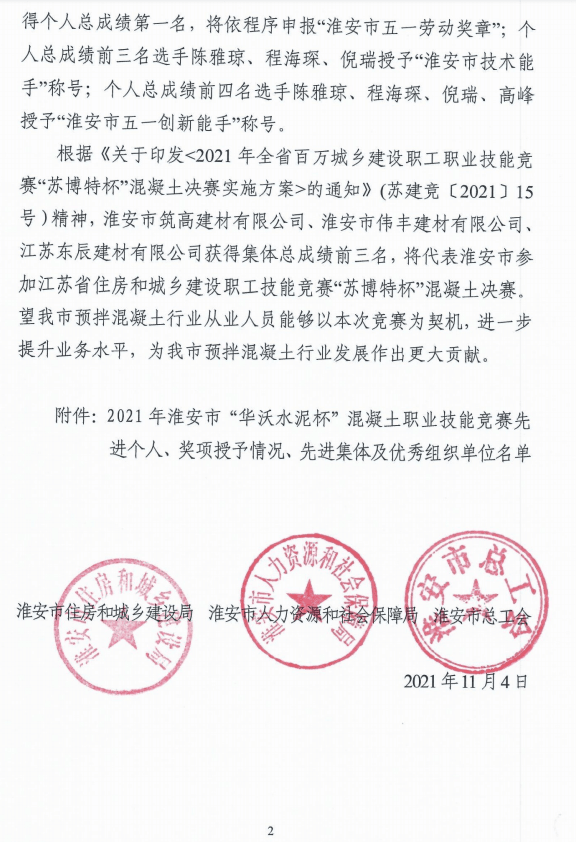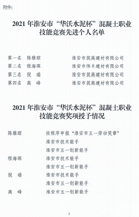其中,来自淮安市筑高建材有限公司的陈雅琼,取得个人总成绩第一名,将依程序申报“淮安市五一劳动奖章”;个人总成绩前三名选手陈雅琼、程海琛、倪瑞授予“淮安市技术能手”称号;个人总成绩前四名选手陈雅琼、程海琛、倪瑞、高峰授予“淮安市五一创新能手”称号。