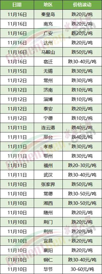 水泥消费核心区域跌价,引发大面积的价格塌方。11月中旬以来湖南、安徽、广西、湖北、四川、贵州、福建、山东、河北等十几个省水泥价格陆续下跌。