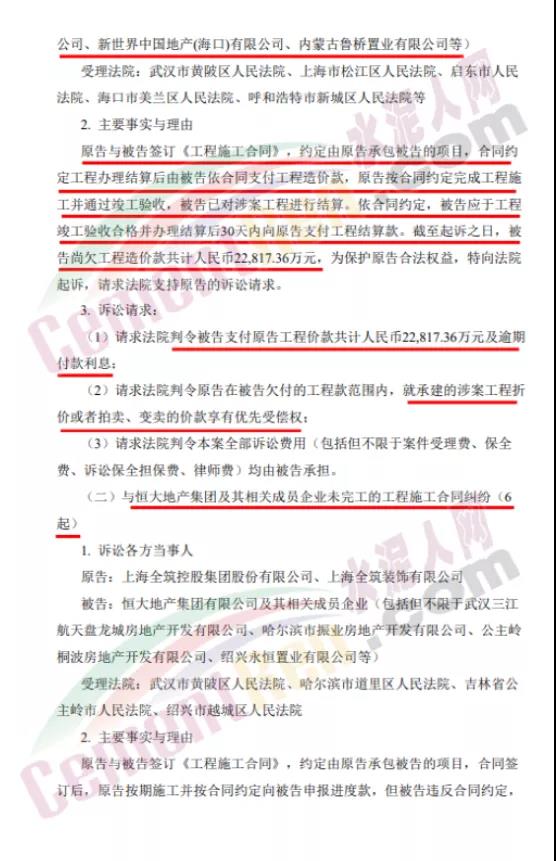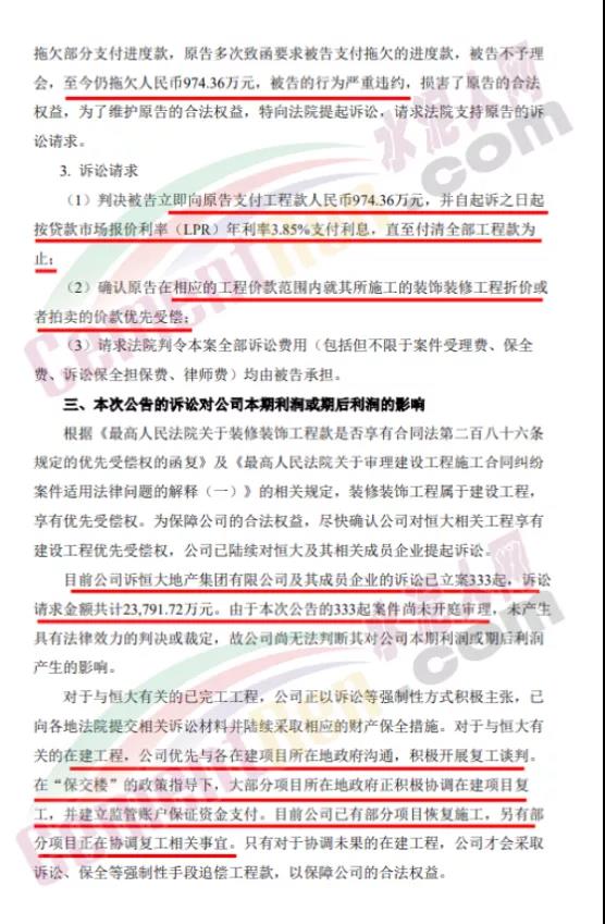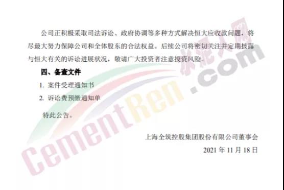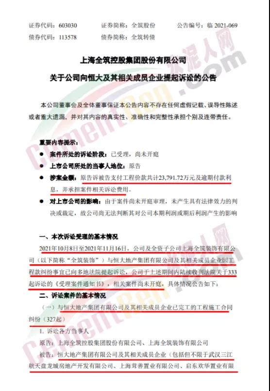 11月17日晚间,全筑股份公告称,公司及全资子公司全筑装饰与恒大地产集团及其相关成员企业因工程款纠纷事宜已向多地法院提起诉讼。全筑股份诉恒大方面支付工程价款共计2.38亿元及逾期付款利息,并承担案件相关诉讼费用。全筑股份表示,正积极采取司法诉讼、政府协调等多种方式解决恒大应收款问题。