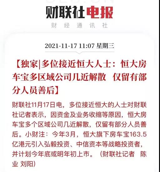 同期,多位接近恒大的人士表示,因资金及业务收缩等原因,恒大房车宝多个区域公司几近解散,仅留有部分人员善后。