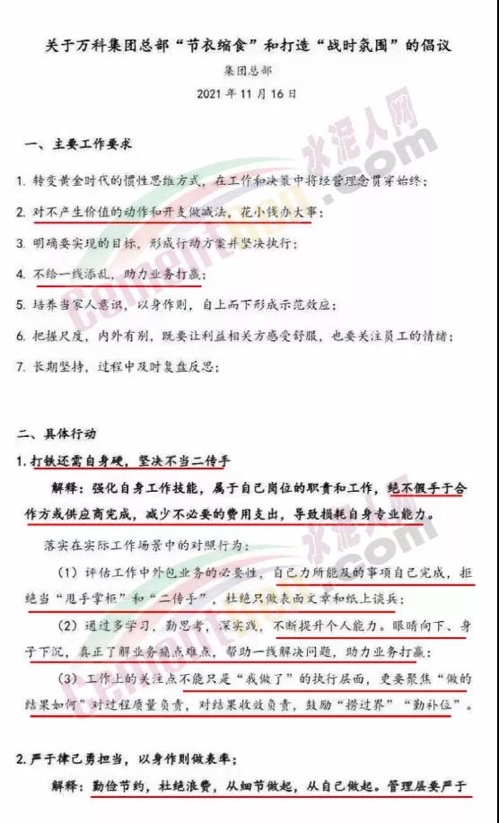 同期,万科总部下发了一份主题为《关于万科集团总部“节衣缩食”和打造“战时氛围”的倡议》,共提出7点工作要求两条具体行动。