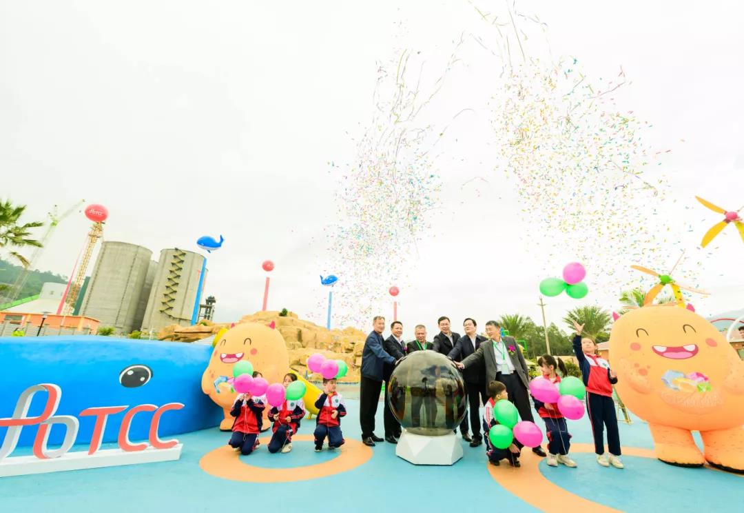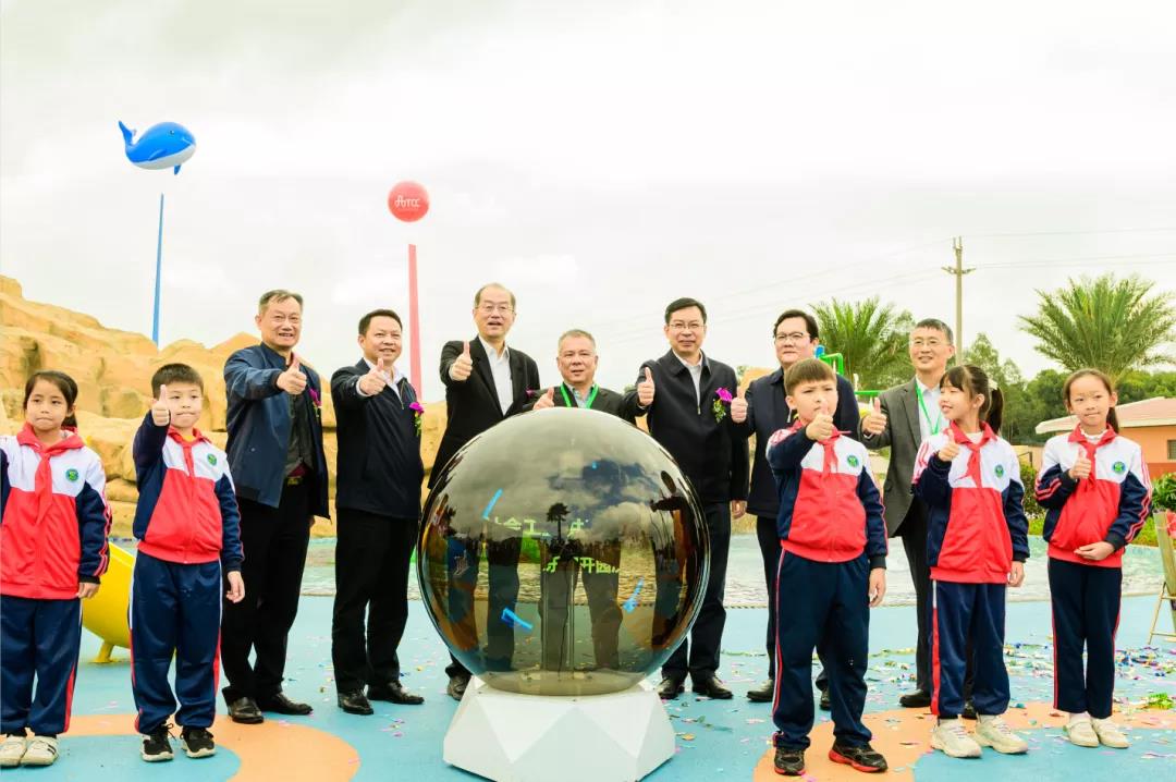 众嘉宾与台泥韶关厂周边小学生在台泥戏水乐园开园庆典上共同按动水晶球