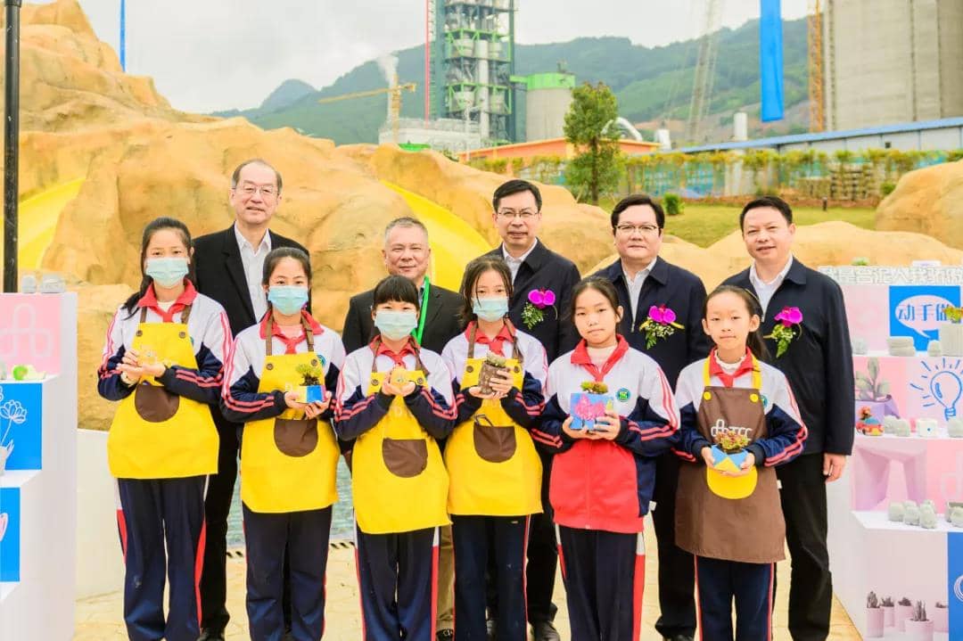 众嘉宾与台泥韶关厂周边小学生以及台泥环保大使GEMMA圆宝庆贺戏水乐园开园