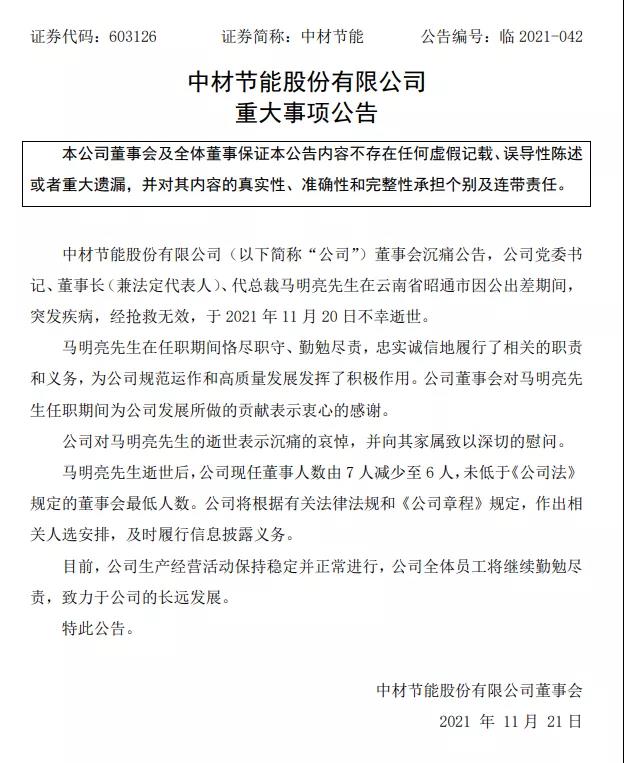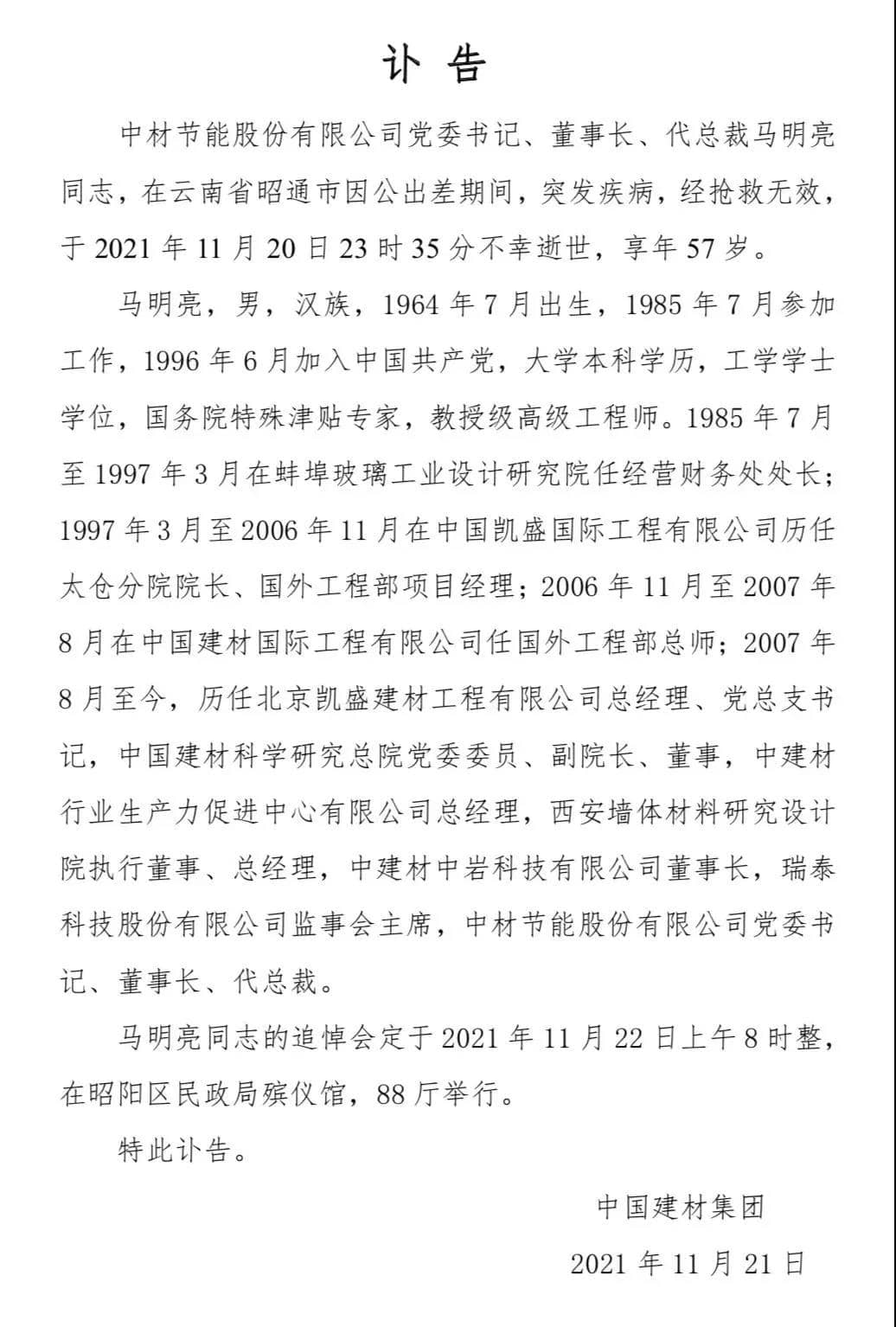 11月21日中国建材集团发布讣告称,中材节能股份有限公司党委书记、董事长、代总裁马明亮同志,在云南省昭通市因公出差期间,突发疾病,经抢救无效,于2021年11月20日23时35分不幸逝世,享年57岁。