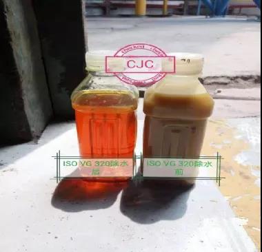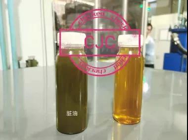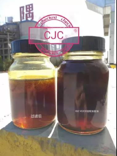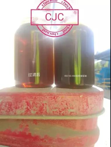 由上表可以看出,安装CJC木质纤维精密过滤系统后,仅在线过滤1天时间,冀东水泥A企业油老化就被控制住,设备磨损达到合格水平。过滤前后油样对比图片如下: