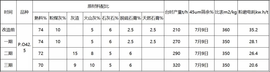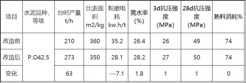 三期改造是专门针对节能降耗进行的技改工程,月度平均台时达到320 t/h。提产25t/h左右;电耗下降5.8kw.h/t,熟料消耗下降2%。水泥3天、28天强度均有提高,取得了满意的效果。