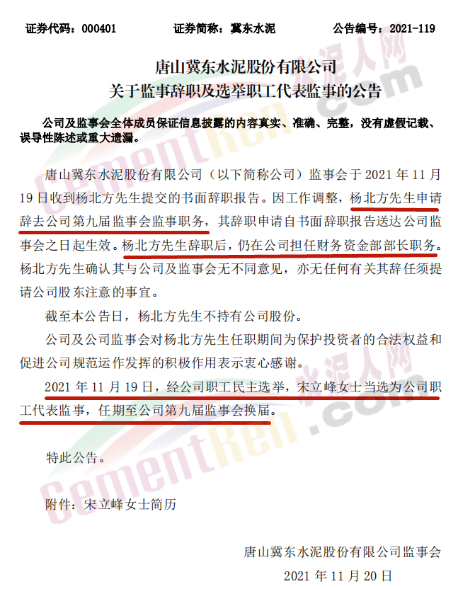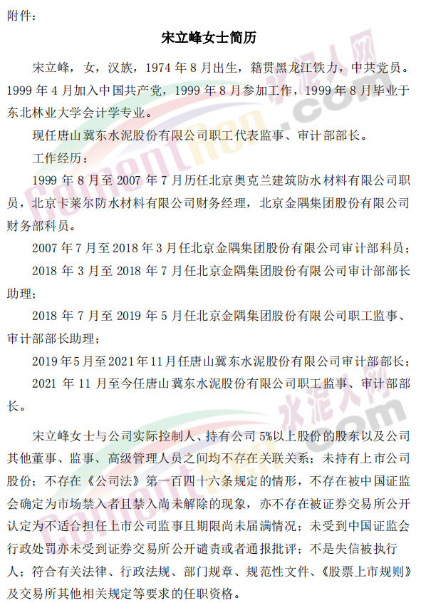 日前,冀东水泥发布《唐山冀东水泥股份有限公司关于监事辞职及选举职工代表监事的公告》称,杨北方先生申请辞去公司第九届监事会监事职务,辞职后,仍在公司担任财务资金部部长职务。经公司职工民主选举,宋立峰女士当选为公司职工代表监事,任期至公司第九届监事会换届。具体公告如下: