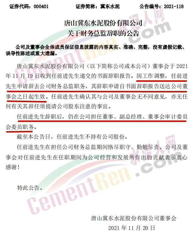 同日,唐山冀东水泥股份有限公司发布关于财务总监辞职的公告称,因工作调整,任前进先生申请辞去公司财务总监职务,任前进先生辞职后,仍在公司担任董事、副总经理、董事会审计委员会委员职务。具体公告如下:
