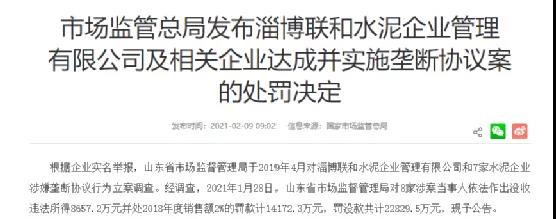 据了解,今年2月9日国家市场监督管理总局反垄断局发布淄博联合水泥企业管理有限公司及相关企业达成并实施垄断协议案的处罚决定。2021年1月28日,山东省市场监督管理局对8家涉案当事人依法作出没收违法所得8657.2万元并处2018年度销售额2%的罚款计14172.3万元,罚没款共计22829.5万元。