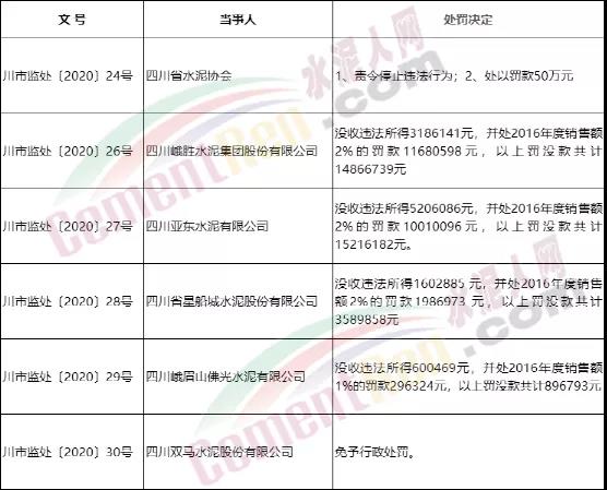 四川省市场监督管理局发布6条《行政处罚决定书》。其中针对于当地水泥行业的处罚决定书提到案件来源及调查经过为:2017年7月,四川省发展和改革委员会从多个途径收到反映四川省水泥协会组织本行业经营者联合涨价的举报。经初步核查后,四川省发展和改革委员会于2017年7月20日正式对四川省水泥协会及涉嫌达成并实施垄断协议的六家水泥经营者予以立案调查,总计处罚3506.9572万元。