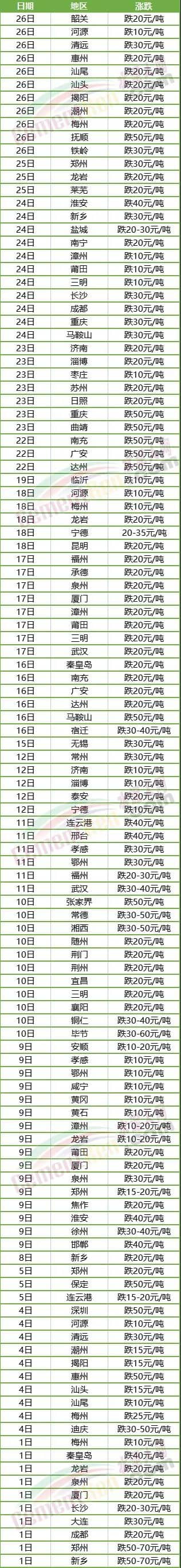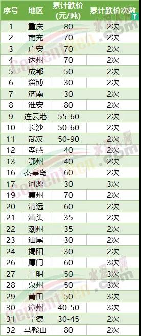 四川南充、广安、达州、成都;山东淄博、济南;江苏淮安、连云港;湖北武汉、孝感、鄂州;广东河源、惠州、清远、汕头、潮州、汕尾、揭阳;福建厦门、三明、泉州、莆田、漳州、宁德;安徽马鞍山、河北秦皇岛、湖南长沙以及重庆地区28个城市连续2-3轮下调水泥报价,累计跌价30-80元/吨。