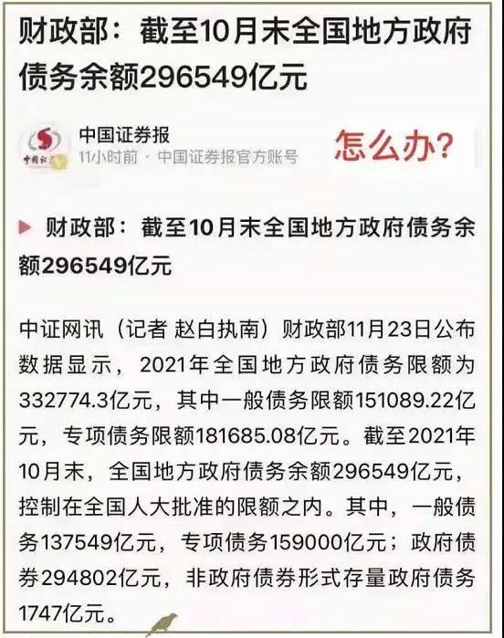 截至2021年10月末,全国地方政府债务余额296549亿元,控制在全国人大批准的限额之内。其中,一般债务137549亿元,专项债务159000亿元;政府债券294802亿元,非政府债券形式存量政府债务1747亿元。