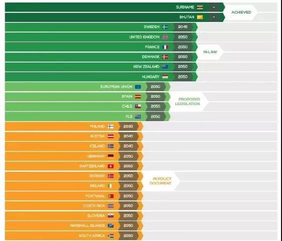“碳中和、碳达峰”是全球各国的共识,目前已有数十个国家和地区提出了“零碳”或“碳中和”的气候目标,Energy & Climate Intelligence Unit 的净零排放跟踪表统计了各个国家进展情况,包括:已实现的2个国家,已立法的6个国家,处于立法中状态的包括欧盟(作为整体)和其他3个国家。