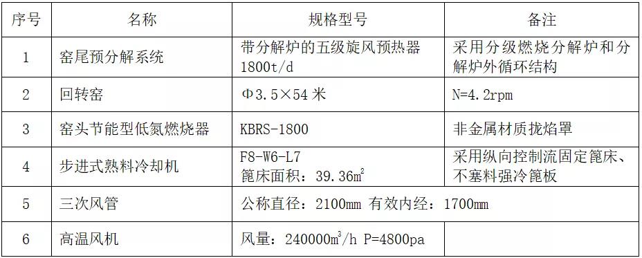 据科邦高级工程师郭红军介绍,采用这项技术的水泥厂,设计生产规模为1800t/d,配备Φ3.5*54米回转窑,窑尾采用带分解炉的五级旋风预热器,采用升级型的第四代步进式篦冷机,窑头采用节能型低氮燃烧器。烧成系统主要设备配置情况见下表: