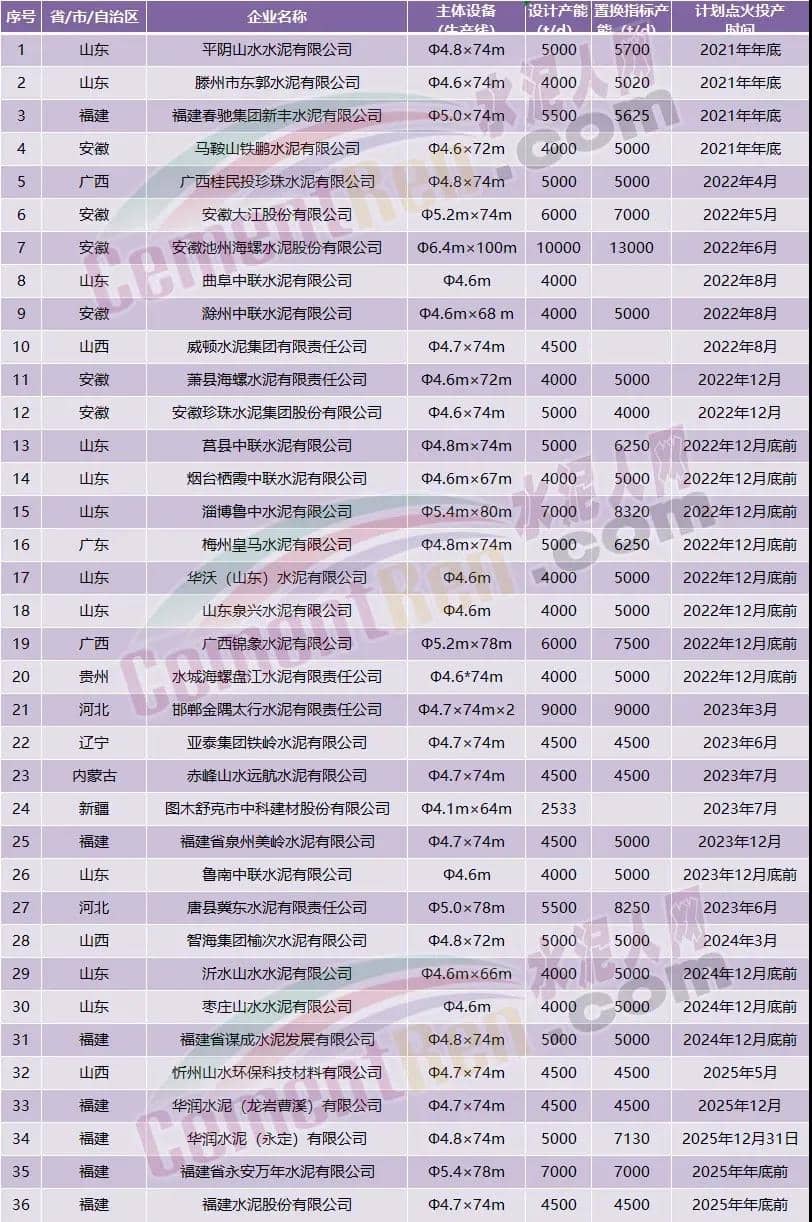 同时,有大量的智能化高产水泥生产线陆续建成投产。据不完全统计从2021年至2025年底前将有37条5340.9万吨/年。新型干法水泥熟料生产线点火投产。拟于2021年12月-2025年12月期间点火投产部分生产线如下: