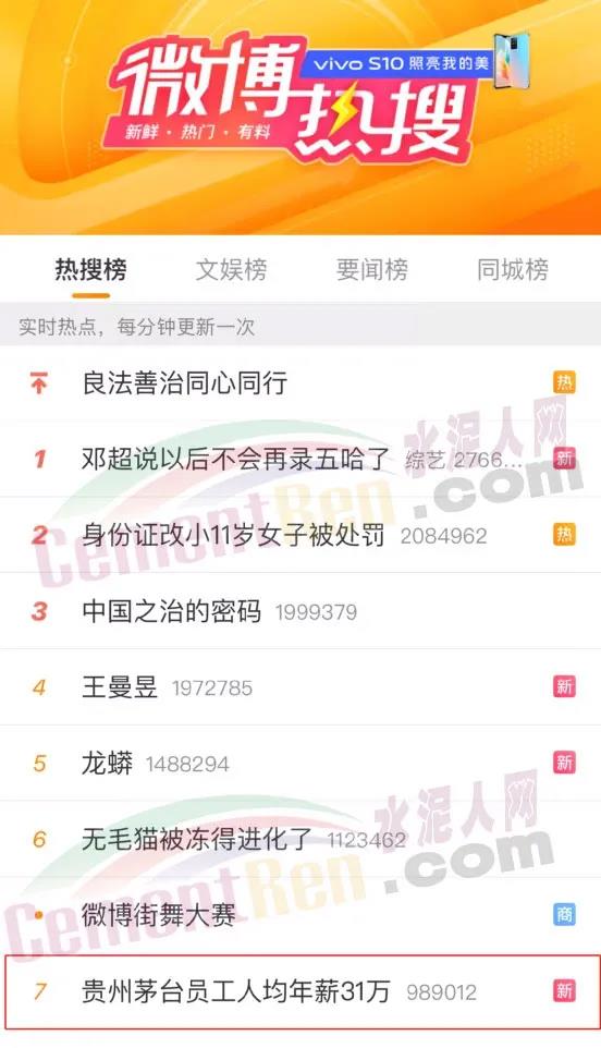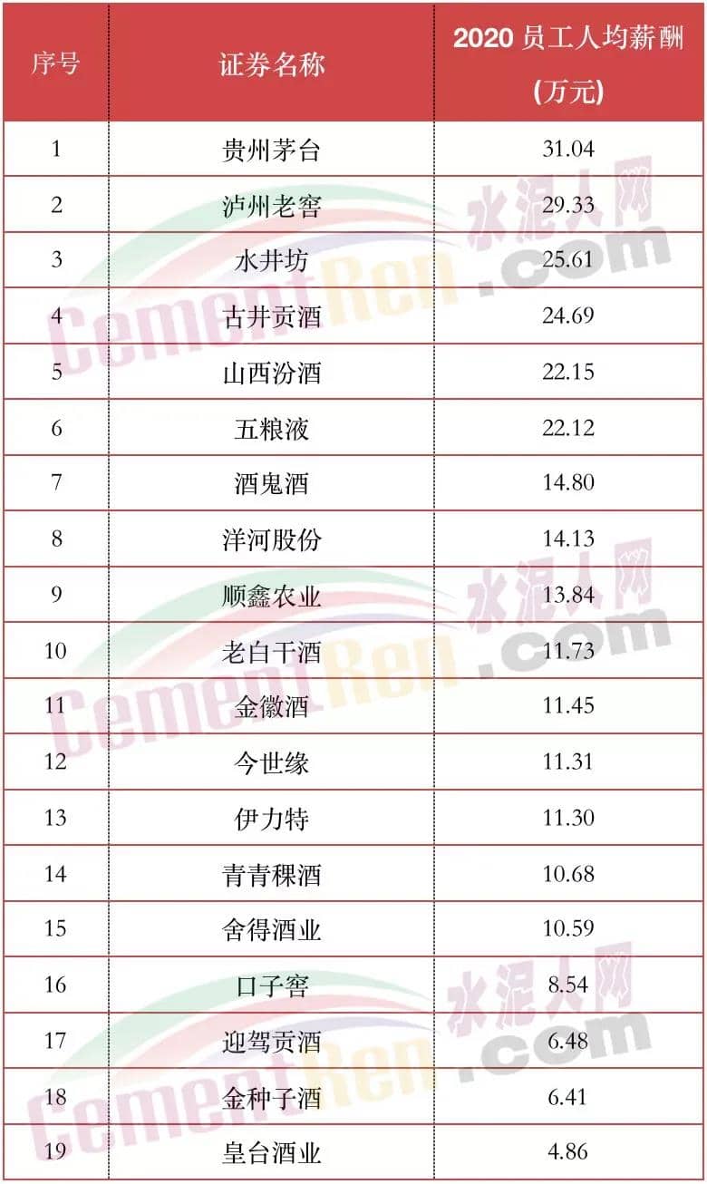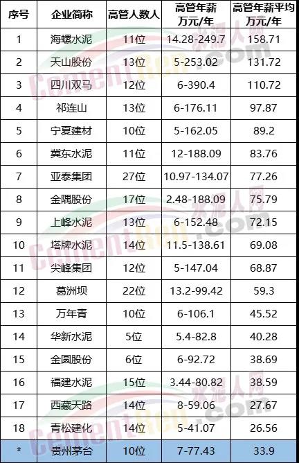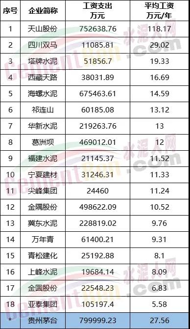 对比上市公司最新公布的水泥行业高管年薪及员工平均薪酬,水泥行业18家上市公司,海螺水泥以高管年薪平均158.71万元/年位于首位,天山股份员工年薪平均131.72万元/年位于第二位。按最新公布数据计算,海螺水泥高管平均年薪较贵州茅台高出124.81万元/年,员工平均工资却低出12.97万元/年。