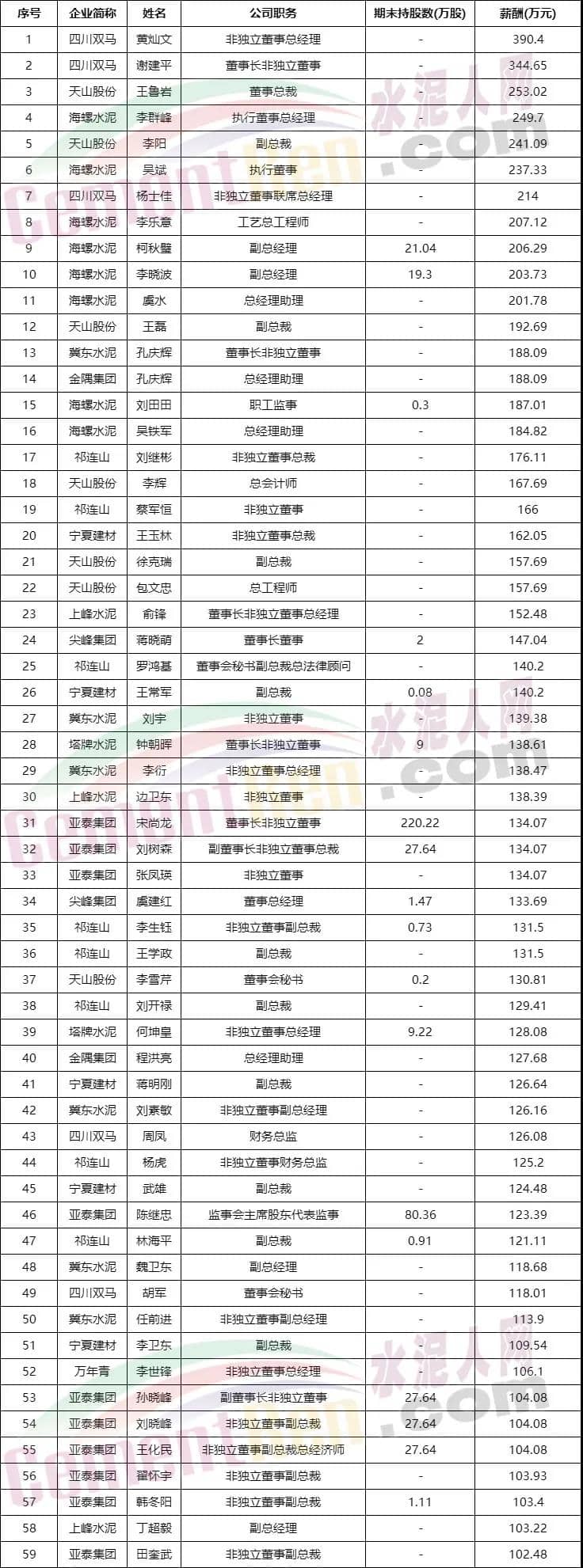 从最新公布的高管年薪数据来看,四川双马董事长黄灿文和总经理谢建平分列高管年薪第一位和第二位,分别为390.4万元和344.65万元;第三位天山股份董事总裁王鲁岩年薪253.2万元;海螺水泥执行董事总经理年薪249.70万元位于第四位。