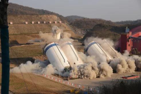此次爆破拆除项目共有5个建筑物,包括4个高达28米的骨料成品库和1个高达24米的骨料半成品库,外径均为12.5米。