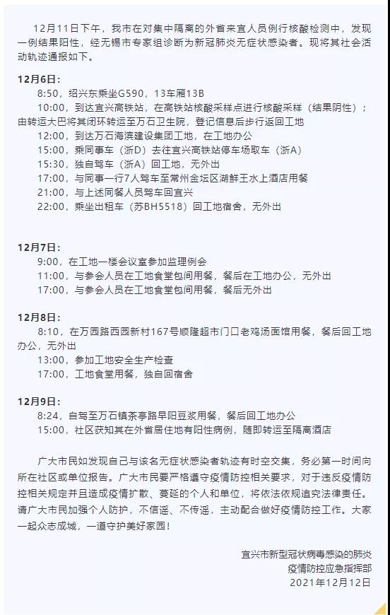 日前 ,江苏宜兴市通报发现一例新冠肺炎无症状感染者。通报显示,该感染者6日从浙江绍兴到宜兴,期间在万石海滨建设集团工地等区域活动,从其活动轨迹可见,该感染者曾参加监理例会和工地安全生产检查。经排查,密切接触者共63人,次密切接触者共560人。全部集中隔离并规范开展核酸检测,已出结果均为阴性。