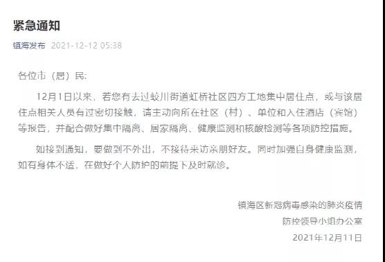 继江苏宜兴之后,浙江宁波同一工地13人确诊。浙江宁波镇海区发布紧急通知,要求自12月1日以来,有去过蛟川街道虹桥社区四方工地集中居住点,或与该居住点相关人员有过密切接角的人员主动向所在社区(村)、单位和入住酒店(宾馆)等报告 。