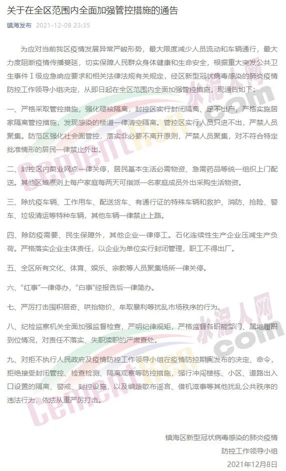 目前,宁波市继续维持全市I级响应不变,继续维持镇海区临时封闭管理措施不变,浙江省严控跨省出行不变。