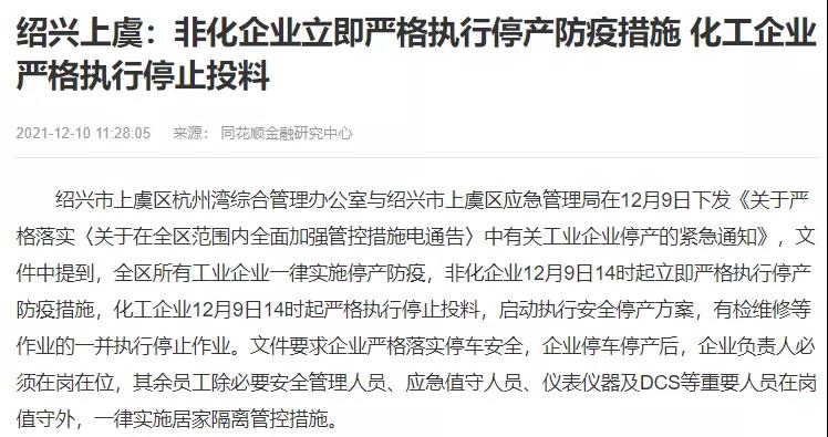 全区所有工业企业一律实施停产防疫,非化企业12月9日14时起立即严格执行停产防疫措施,化工企业12月9日14时起严格执行停止投料,启动执行安全停产方案,有检维修等作业的一并执行停止作业。
