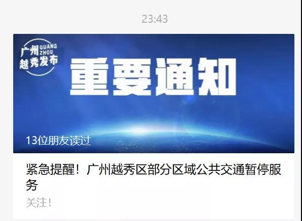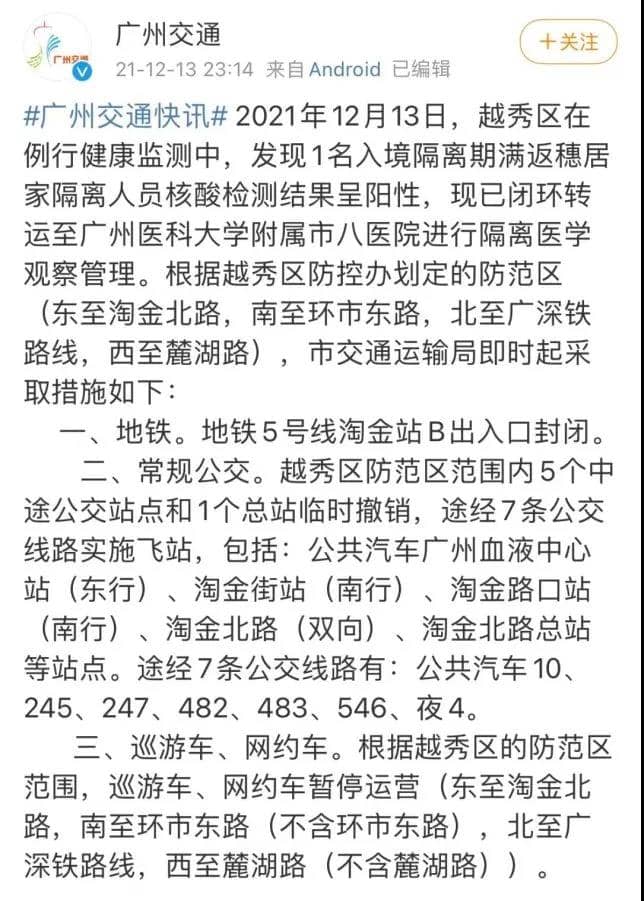 广州越秀区部分区域公共交通暂停服务。根据越秀区防控办划定的防范区(东至淘金北路,南至环市东路,北至广深铁路线,西至麓湖路),广州市交通运输局即时起采取措施如下: