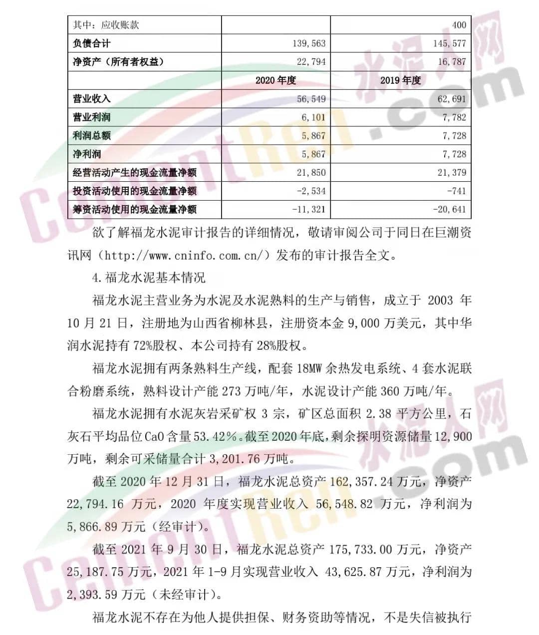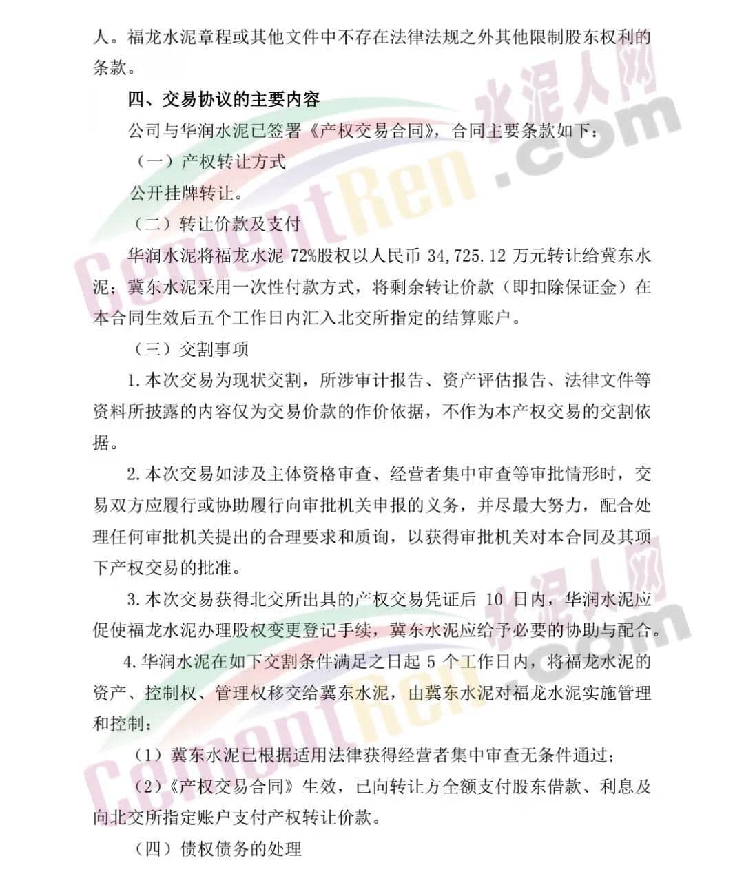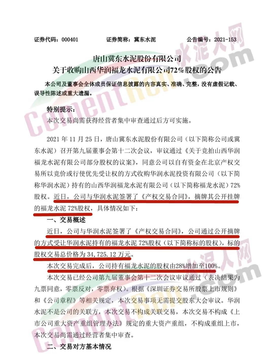 12月15日晚间,冀东水泥发布公告称,近日,公司通过公开摘牌的方式受让华润水泥持有的福龙水泥72%股权,标的股权交易总价格为3.47亿元。此次交易完成后,公司持有福龙水泥的股权由28%增加至100%。福龙水泥拥有完整的水泥熟料生产线,装备和工艺水平比较先进,拥有资源品位较好的石灰石矿山,周边辅材丰富,生产成本在区域处于领先水平。此次交易有利于公司优化山西区域的产能结构。