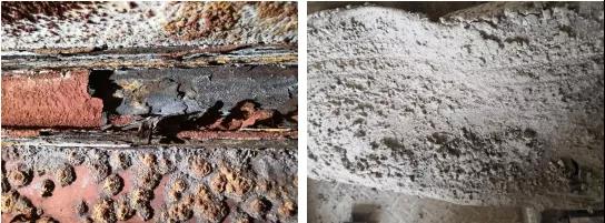 窑尾除尘器腐蚀现象(左)窑尾除尘器“糊袋”现象(右)