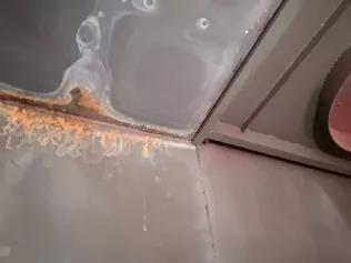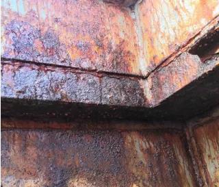 壳体焊缝区域,由于焊条与壳体基材存在成分差异,焊缝影响区域与基材亦存在成分差异,成分差异会加速电化学腐蚀。板材连接区域及夹角区域,细小缝隙聚集酸性凝结液后,形成“缝隙腐蚀”,加快腐蚀发展速度。现场实地勘察发现,焊缝区域和板材连接区域的腐蚀比其他区域更为严重。
