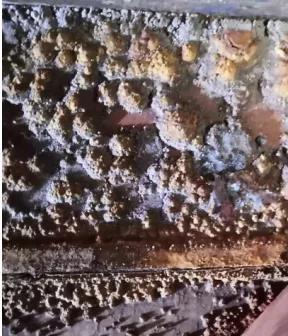 硫氧化物腐蚀外观表象为腐蚀区域成片分布且较均匀,附着层状、块状松散腐蚀产物,颜色多为棕褐色及黑色。