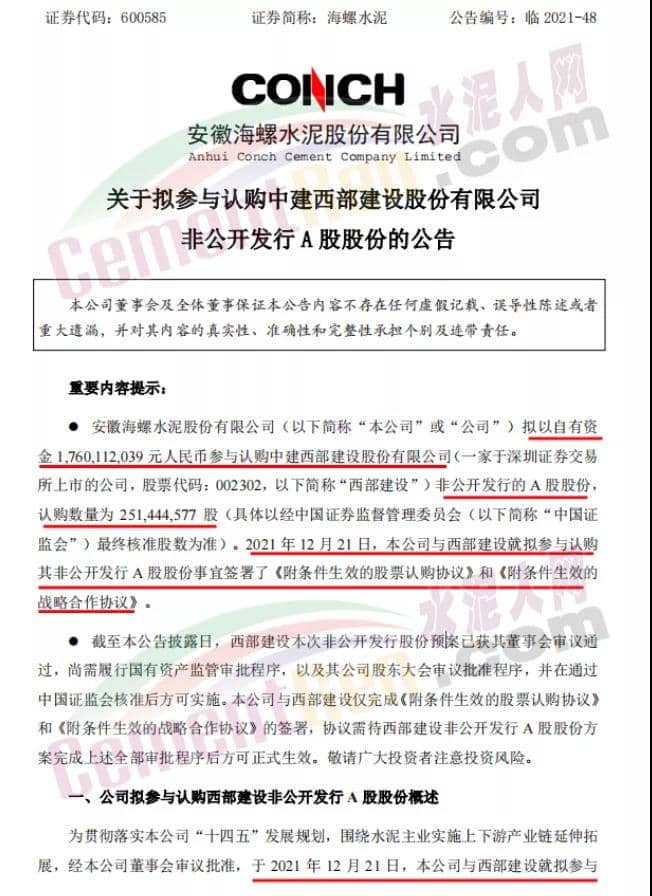 海螺水泥公告称,为贯彻落实本公司“十四五”发展规划,围绕水泥主业实施上下游产业链延伸拓展,经本公司董事会审议批准,于2021年12月21日,本公司与西部建设就拟参与认购其非公开发行股份事宜签署了《附条件生效的股票认购协议》和《附条件生效的战略合作协议》。西部建设是国内领先的建材产业综合服务商,也是国内商品混凝土行业的领军企业,本公司拟通过认购其非公开发行A股股份的方式,进一步加强双方在原材料供销、混凝土业务、砂石骨料业务、物流运输、产业互联网等方面的战略合作。