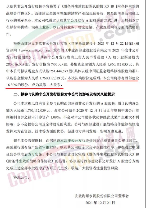 海螺水泥12月21日晚间公告,拟以自有资金约17.6亿元人民币参与认购西部建设非公开发行的A股股份,认购数量为2.51亿股。本次认购股份完成后,本公司将持有西部建设16.3%的股份,成为其第二大股东。