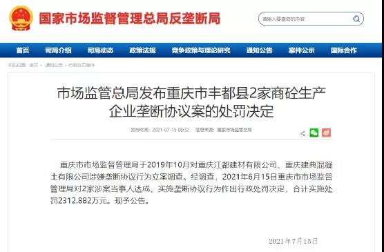 7月15日市场监管总局就发布重庆市丰都县2家商砼生产企业垄断协议案的处罚决定,合计实施处罚2312.882万元。