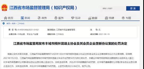 日前,江西省市场监管局对丰城市预拌混凝土协会及其8家会员企业涉嫌垄断协议进行处罚,罚没款共计2.86亿元。